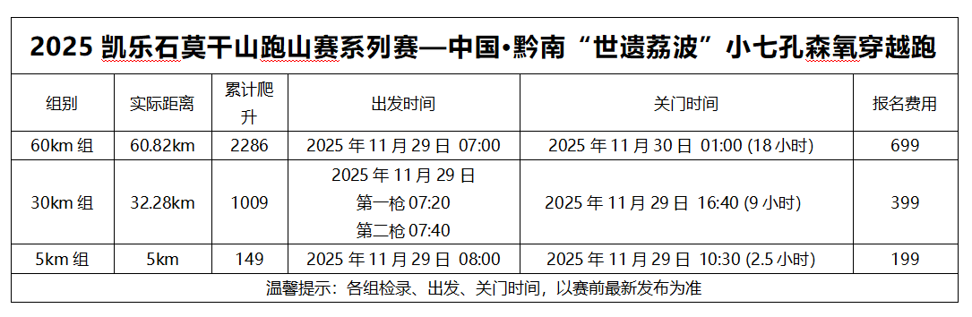 ①每一位参赛选手(同证件号码)仅能在2025小七孔森氧穿越跑报名唯一一个名额,如发现重复报名(不论是报名平台重复,还是参赛组别重复)组委会有权强制取消参赛选手的其他重复名额,直至仅保留唯一名额。