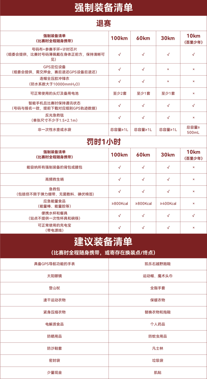 (3)未按照要求携带强制装备(号码布、卫星定位设备、可通信手机、头灯及备用电池、连帽冲锋衣、反光急救毯等)的行为;