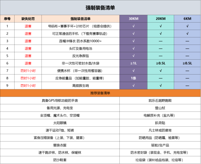 1、因本届赛事跨越时间比较长,早晚温差比较大,考虑安全的因素,组委会将在中途严格进行强制装备检查,若发现参赛者没有按规定备齐强制装备,将会进行罚时处罚或取消参赛者的成绩,并拒绝其继续参赛。